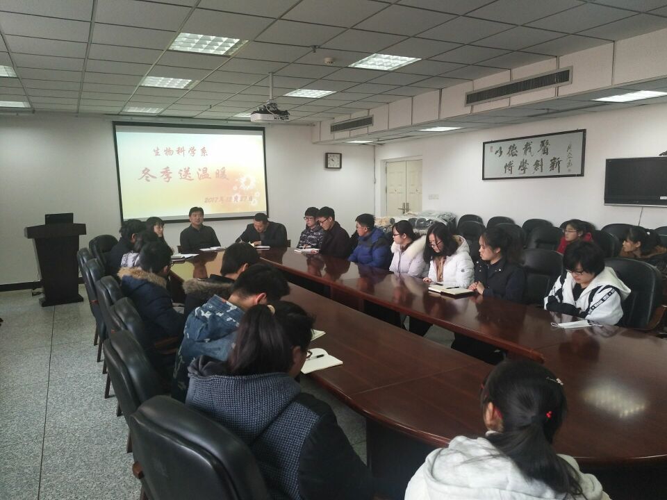 冬季送温暖活动是学生资助工作的重要组成部分,也是学校对贫困生关爱的重要表现,为体现学校、院系对困难学生的真切关怀,生物科学系于2017年12月27日上午10:40,主楼东302会议室展开了以“冬季送温暖”为主题的活动。参会人员有生物科学系党总支书记孙甫存书记、党总支副书记米燕燕书记、学管办主任陈凤鸿主任以及22位受助学生。