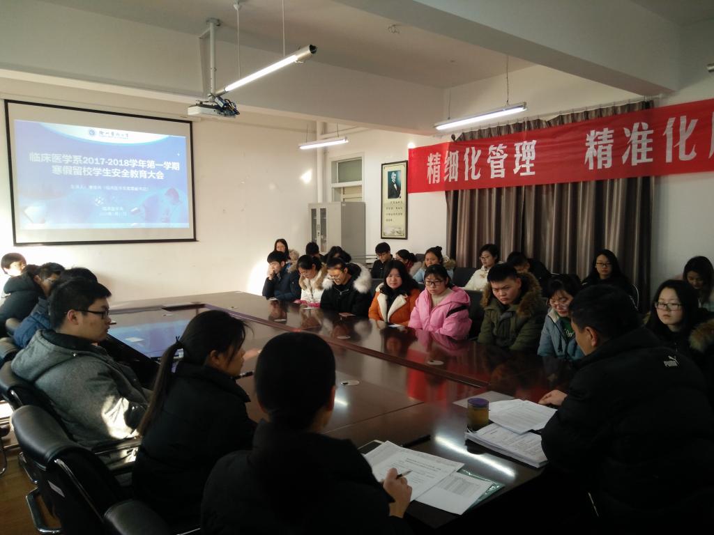 1月10日临床医学系各年级期末考试均已结束,为进一步促进平安、和谐校园建设,做好寒假期间留校学生的安全保障工作,1月11日临床医学系党委唐俊兵副书记主持召开了全系寒假留校学生的安全教育大会。临床医学系各年级负责老师及全体假期留校同学参加了会议。