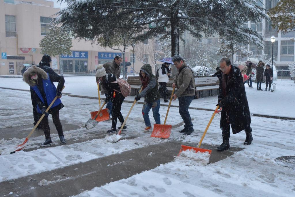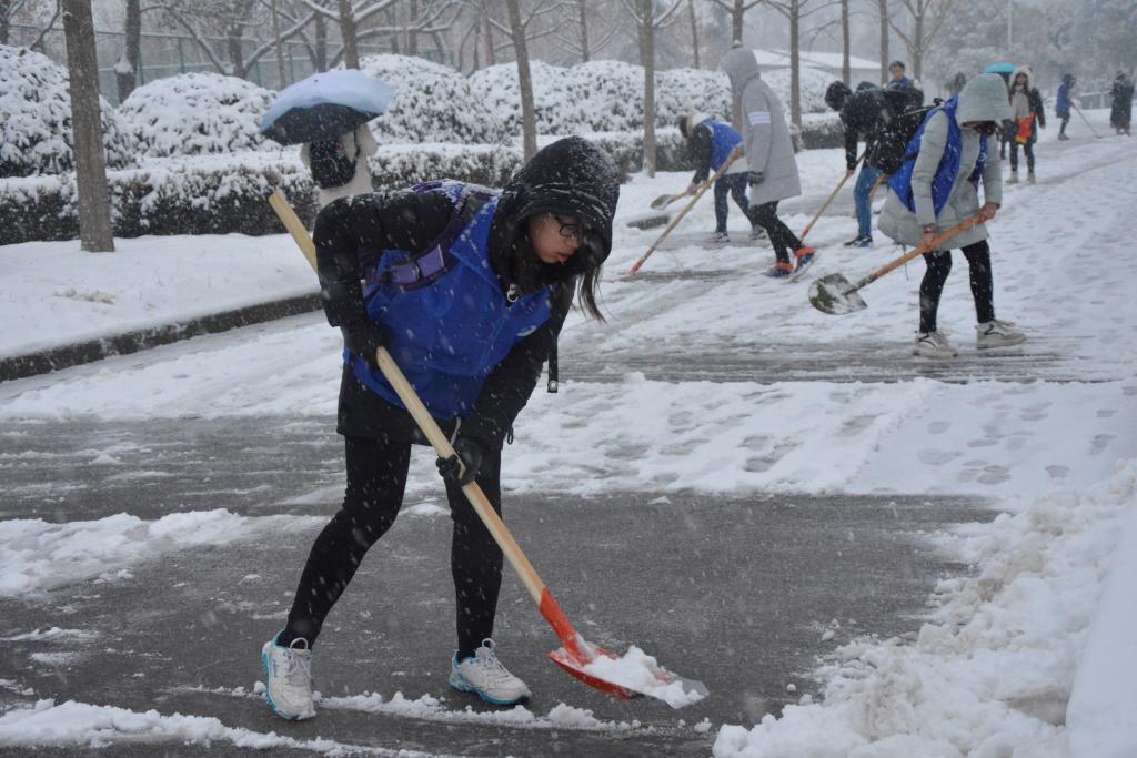 寒风凛冽,白雪漫天飞舞,同学们不惧严寒,纷纷拿起工具,扫除积雪。志愿者们拿着铁锹从五号宿舍楼门口开始清扫活动,一直到延伸到科教楼E座门口。老师们以身作则,发挥了模范带头作用。大家铲的铲,扫的扫,分工明确,认真细致地完成每一个环节。道路上、广场上,呈现出一幅幅热火朝天的扫雪铲冰景象。尽管大家的脸冻的通红、头发上也满是积雪,但这些都丝毫不影响志愿者们除雪的热情,手中的工具没有停止挥舞。经过齐心协力的奋战,大家仅用半个小时就打通了校园的东西通道,确保了道路的畅通和安全。在劳动过后志愿者们的身体渐渐变得温暖,就如同志愿者们的爱心一样火热。
