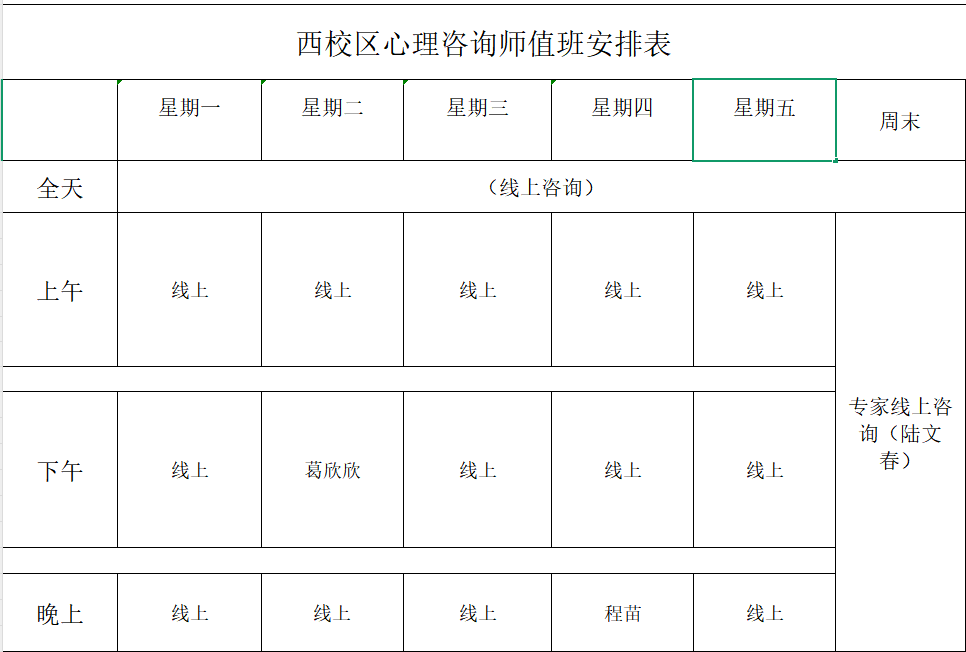 3.西校区值班室地址:男生宿舍与女生宿舍中间心理咨询室。